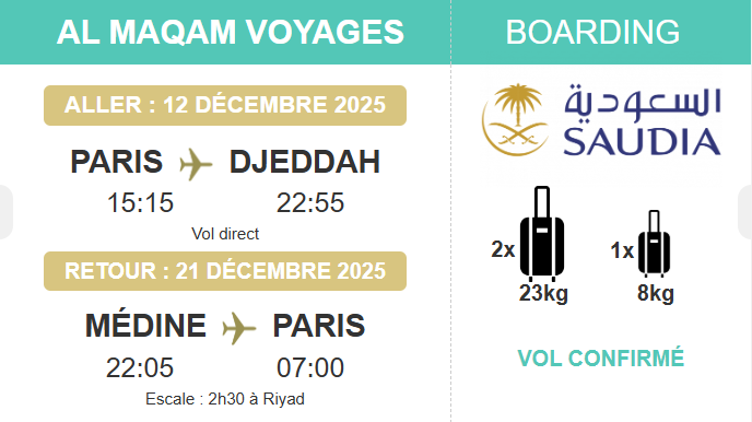 Partez en omra pour décembre dans les meilleures conditions avec notre agence Al Maqam Voyages. Avec plusieurs départs par mois depuis Paris vers la Mecque, profitez d’une organisation sur mesure pour vous garantir un voyage exceptionnel.