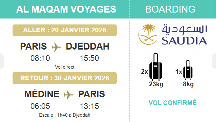 Pour votre Omra en janvier 2026, découvrez nos options ci-dessus de réservation conçues pour vous offrir le meilleur rapport qualité-prix. Que vous voyagiez en groupe ou individuellement, nous avons pensé à tout pour rendre votre pèlerinage inoubliable. Profitez de vols en avion vers les lieux saints, avec un encadrement dès l’aéroport. Votre billet inclut non seulement le trajet aller-retour, mais aussi les transferts vers les sites sacrés comme Mina et Arafat.